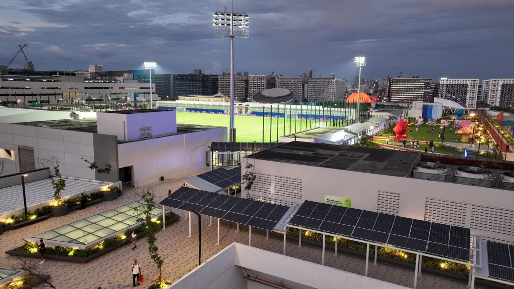 SM Mall of Asia’s MOA Sky showcases a multi-use rooftop with a solar-covered walkway, contributing to their significant renewable energy capacity.