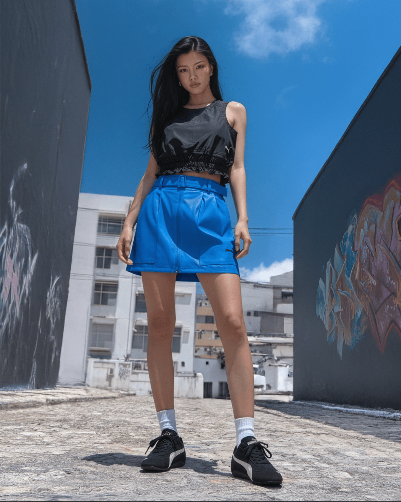 Drop 2 continues the Prime Squared narrative of blending classic designs with modern functionality. The Future Puma Archive line spotlights mesh textures, layered surfaces, and sleek tailoring that echo downtown energy. Highlights include the Mesh Crop Top (PHP 3,200) in Puma White or Mountain Blue and the Straight Patch Pocket Skirt (PHP 3,200) designed with structured edges and clean lines.