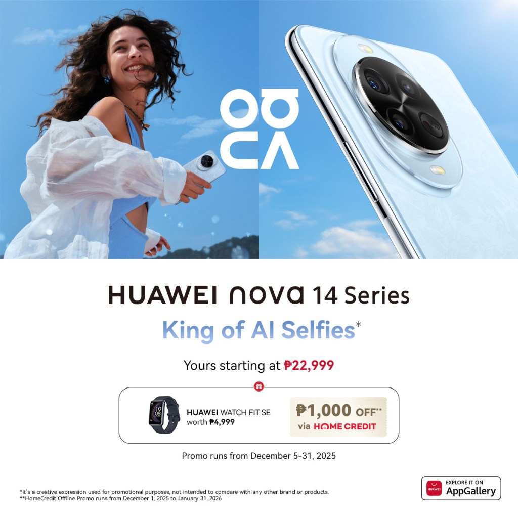Make every selfie look perfect with the HUAWEI nova 14 Series, now available on the HUAWEI Online Store, Lazada, Shopee, TikTok, and at HUAWEI Experience Stores nationwide. Make the HUAWEI nova 14 Pro (PHP 32,999) or the HUAWEI nova 14 (PHP 22,999) yours today and get a free HUAWEI WATCH FIT SE (worth PHP 4,999).